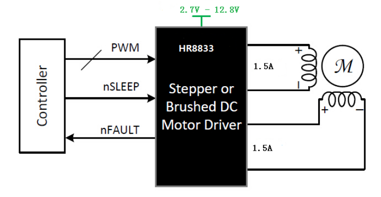 HR8833為玩具、打印機和其它電機一體化應用提供一種雙通道電機驅動(dòng)方案。HR8833有兩路H橋驅動(dòng),可以驅動(dòng)兩路刷式直流電機,或者一個(gè)雙極步進(jìn)電機,或者螺線(xiàn)管或者其它感性負載。